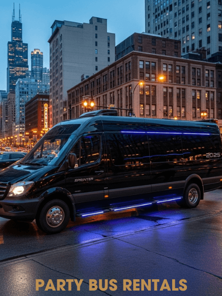Royal Limo Services in Chicago provides exceptional Chicago limo service and party bus rentals, designed to elevate your group travel experience. Our fleet includes the luxurious 15-passenger Sprinter Party Bus, perfect for events like weddings, proms, concerts, or any special occasion. Combining comfort and style, our services ensure a truly memorable journey.